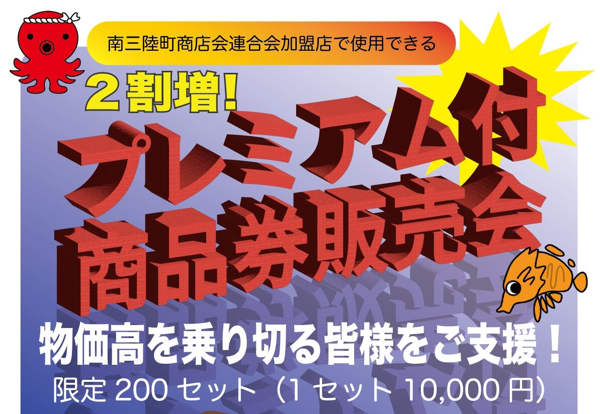 1月25日(日)、2割増しの商品券がついてくる「プレミアム付商品券」の販売会をハマーレ歌津にて開催いたします。